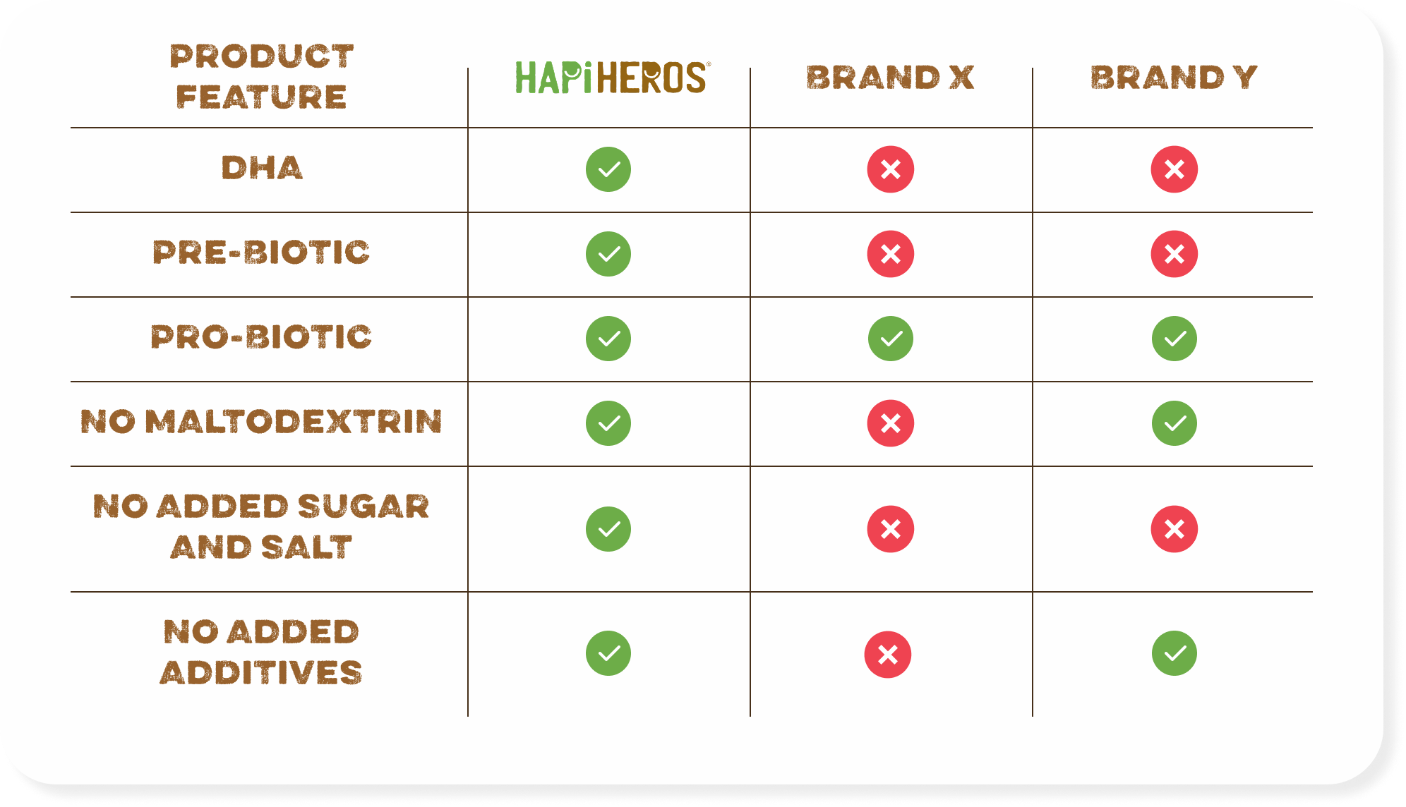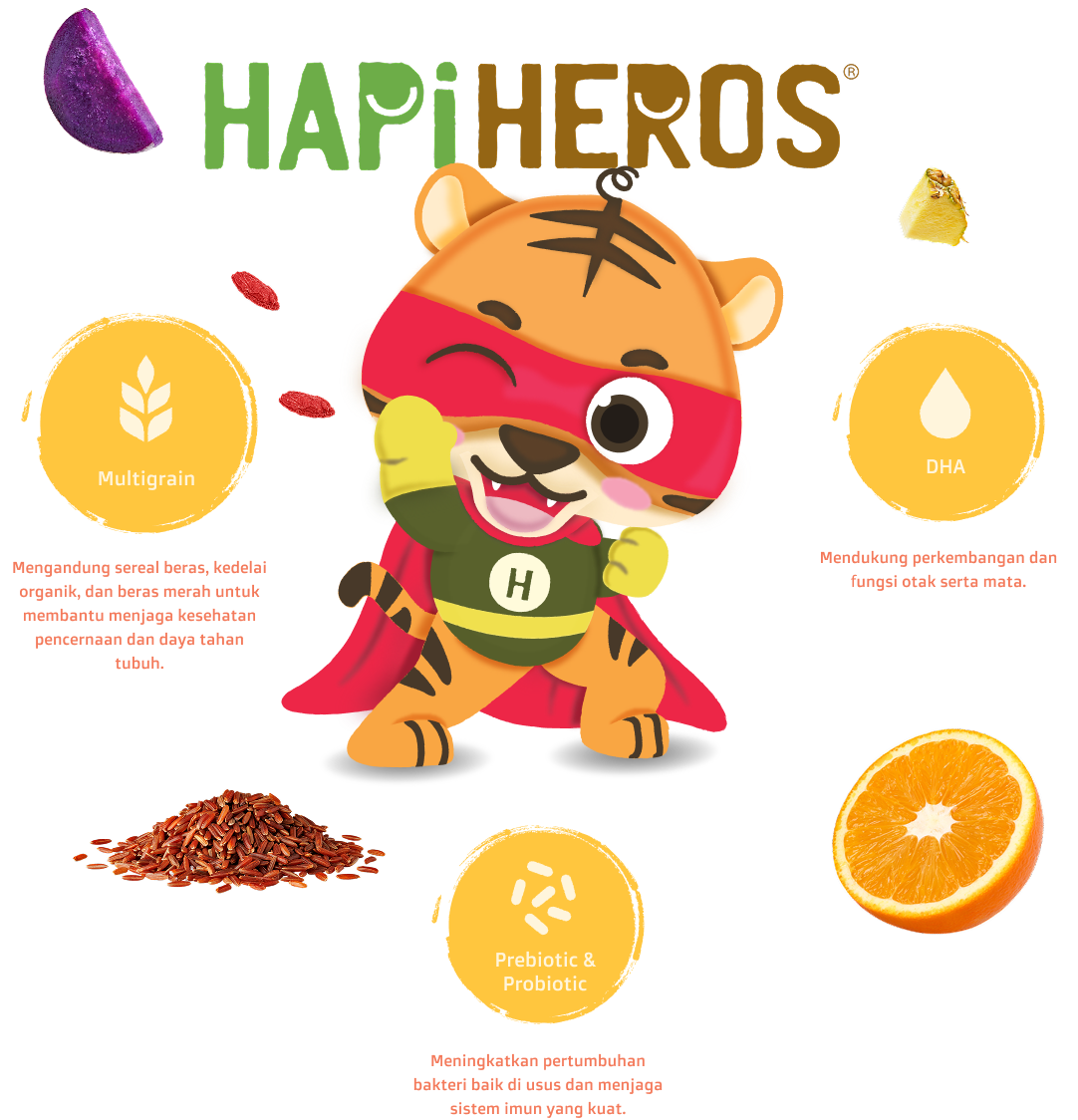 Kami mulai dengan produk inovatif untuk ibu dan anak. Untuk para Ibu ada kue spesial HAPIMOMS yang membantu meningkatkan produksi ASI lebih berkualitas, sementara untuk anak-anak HAPIHEROS sereal dengan rasa khas Asia yang mendukung pertumbuhan anak dewngan rasa seperti ubi ungu dengan goji berry.